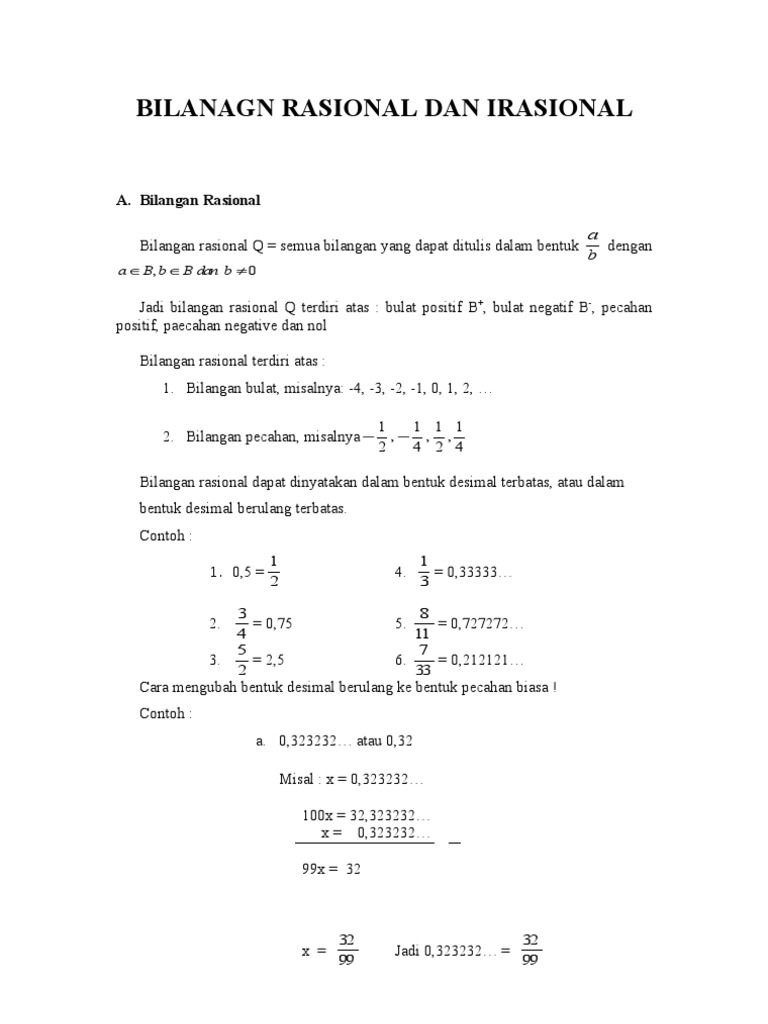 Bilangan rasional bilangan rasional adalah bilangan yang dapat dinyatakan sebagai ab di mana a b bilangan bulat dan b tidak sama dengan 0. Bilangan rasional dapat dinyatakan dalam bentuk pecahan atau bentuk desimal. Berikut ini kami telah menyiapkan beberapa soal dan cara penyelesaiannya yang terdiri dari. Karena pada dasarnya bilangan real dan riil adalah sama serta bilangan real atau riil untuk penjelasan pengertian lengkap sudah pernah dibahas di bab bab sebelumnya ini. Contoh soal perkalian pembagian dan contoh perhitungan bilangan berpangkat lainnya. Pada postingan ini kita membahas contoh soal persamaan dan pertidaksamaan irasional yang disertai penyelesaiannya atau pembahasannya.