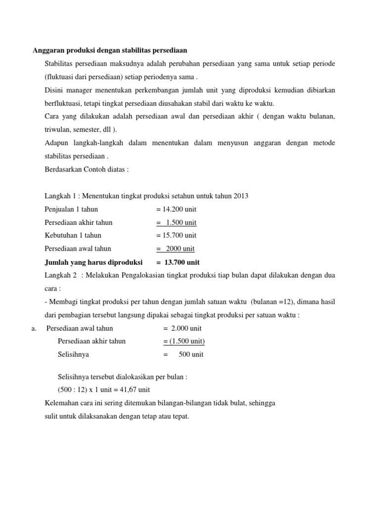 Kebijakan manajemen pt makmur adalah. Tingkat produksi tidak boleh berfluktuasi lebih dari 15 di atas atau di bawah rata rata bulanan. Admin contoh soal terbaik 2019 mengumpulkan gambar gambar lainnya yang berhubungan dengan contoh soal dan jawaban anggaran produksi dibawah ini. Sediaan minimal sebanyak 8 bal dan maksimal 18 bal. Contoh soal dan jawaban sewa guna usaha keputusan melakukan leasing atau tidak pt. Contoh soal anggaran bahan baku perusahaan akan menyusun anggaran material tahun 2005 dgn data sbb.