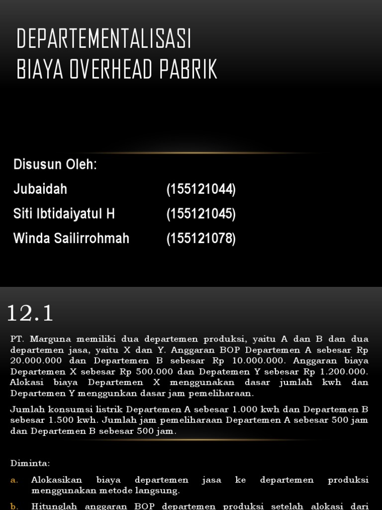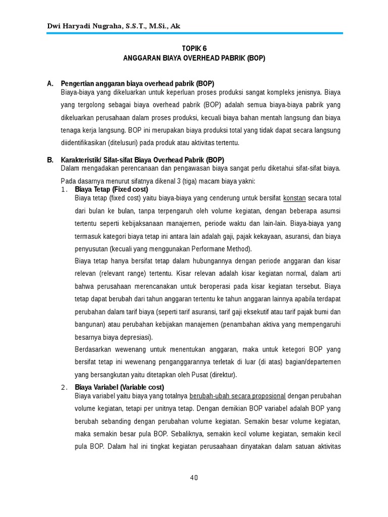 Departementalisasi biaya overhead pabrik adalah pembagian pabrik ke dalam bagian bagian yang disebut departemen atau pusat biaya cost center yang dibebani dengan biaya overhead pabrikfungsi departementalisasi biaya overhead pabrik digunakan untuk menentukan tarif biaya overhead dalam perusahaan yang mengolah produknya melalui beberapa departemen produksi. Berikut ini budget dan realisasi dari biaya overhead pabrik dalam tahun 1997. Biru laut membebankan biaya overhead pada produk dengan tarif yang telah ditentukan di muka. Berapakah bop tetap dan variabel yang dianggarkan dan yang direalisasikan. Hitung tarif bop tetap maupun variabel berdasarkan. Departementalisasi biaya overhead pabrik a.