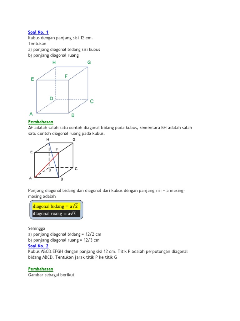 Kubus memiliki jarin jaring yang bermacam macam. Berikut ini adalah pembahasan tentang salah satu unsur kubus dan balok yaitu adanya bidang diagonal yang meliputi pengertian bidang diagonal contoh soal bidang diagonal. Pengertian dari bidang diagonal sendiri iyalah sebuah bidang yang di bentuk dari 2 garis diagonal bidang dan. Panjang diagonal bidang yakni. Diagonal ruang adalah suatu garis yang menghubungkan 2 titik sudut yang saling berhadapan dalam satu ruang. Contoh soal 1 soal.