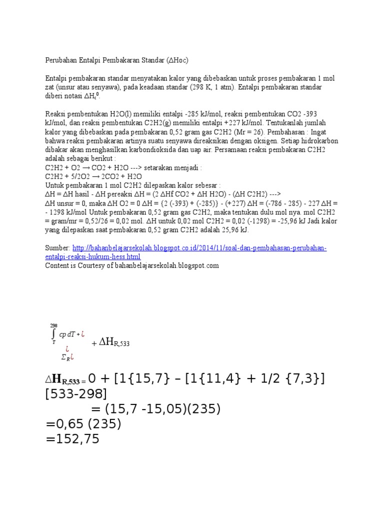 Perubahan entalpi pembakaran c 2 h 2 2600 kjmol yang ini. Entalpi pembakaran cs2 dan nh3 masing masing 1080 kj dan 315 kj. Entalpi tidak bergantung pada jalannya reaksi atau jumlah tahapan reaksi. Belajar itu tidak hanya pada batas memperhatikan tetapi juga bisa mengaplikasikan ilmu yang sudah dipelajariuntuk ituyuk coba latiha beberapa soal berikut terkait dengan entalpi pembakaran standar. Maka perbandingan antara kalor pembakaran sempurna gas propana dgn kalor pembakaran. Entalpi pembakaran standar suatu senyawa menyatakan jumlah kalor yang diperlukan atau dibebaskan untuk proses pembakaran 1 mol senyawa dari unsur unsurnya yang stabil pada keadaan standar stp.