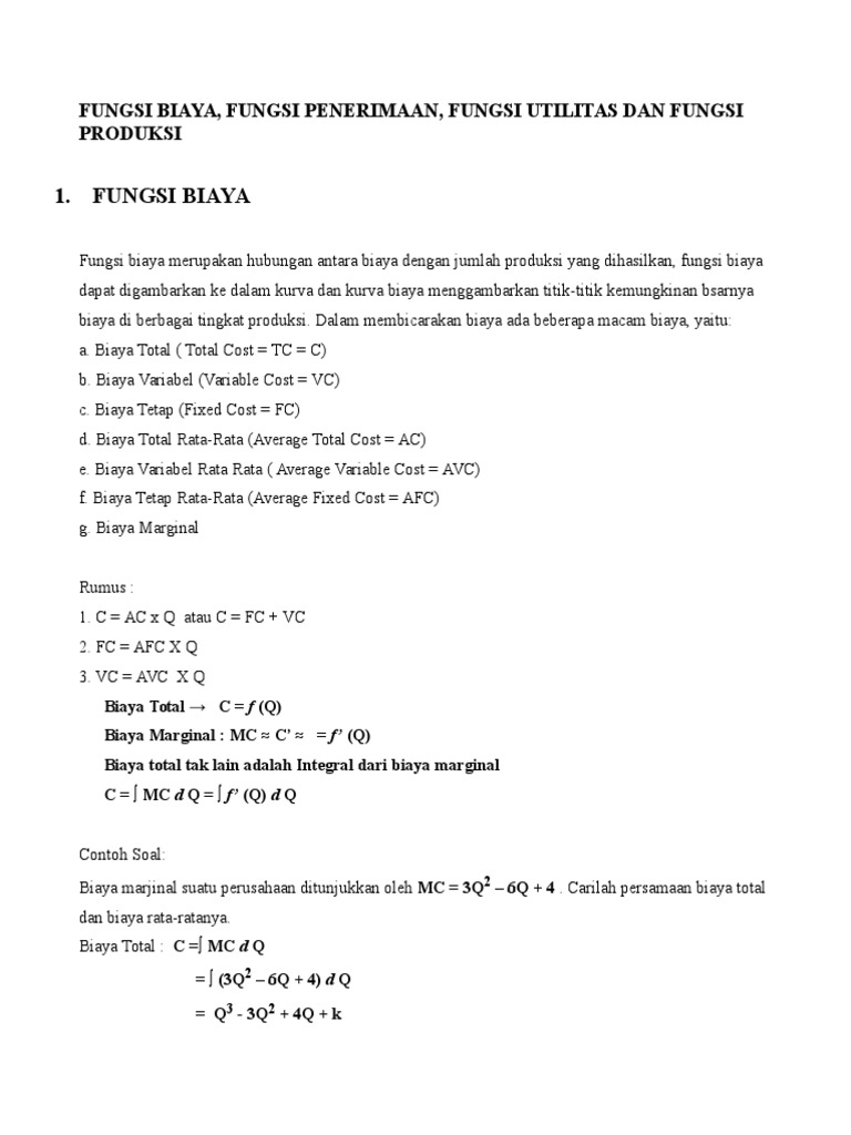 Biaya total yang dikeluarkan oleh suatu perusahaan ditunjukkan oleh persamaan. Biaya total total cost tc c b. Pada tingkat produksi berapa unit biaya total tc ini minimum. Fungsi biaya merupakan hubungan antara biaya dengan jumlah produksi yang dihasilkan fungsi biaya dapat digambarkan ke dalam kurva dan kurva biaya menggambarkan titik titik kemungkinan bsarnya biaya di berbagai tingkat produksi. Contoh soal dan jawaban matematika ekonomi 2 modul 14. Aplikasi deferensial dan integral.