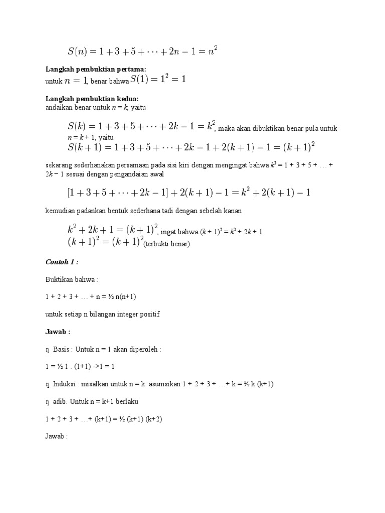 Sekarang kita peroleh 2k1 22k 2k 20 2k 40 k 1 20 iii konklusi. Induksi matematika tidak bisa dipakai untuk menurunkan atau menemukan rumus. Pertama kita harus menunjukkan bahwa rumus tersebut benar ketika n 1. Pertama kita harus menunjukkan bahwa rumus tersebut benar ketika n 1ketika n 1 rumus tersebut benar karena bagian kedua induksi matematika memiliki dua langkah. Contoh soal induksi matematika 3. Kamu akan diajak untuk memahami materi hingga metode menyelesaikan soal.