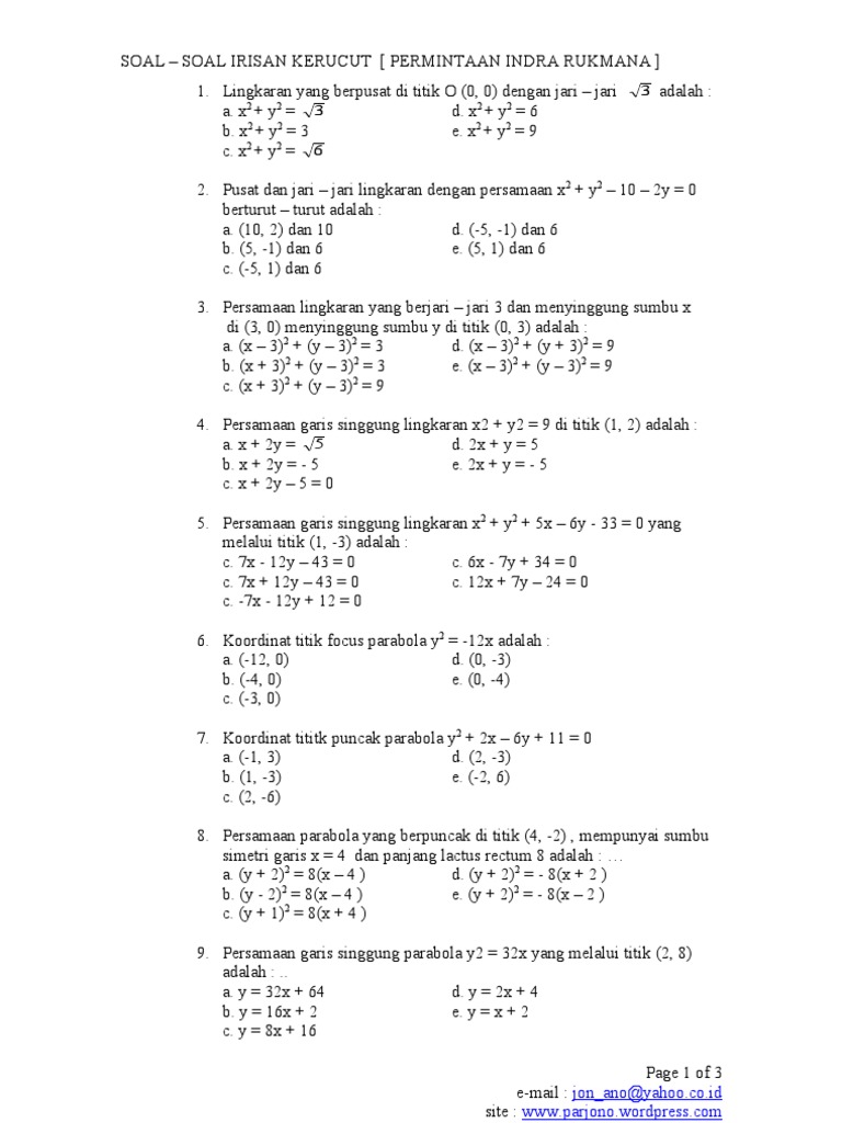 Salah satu jenis irisan kerucut ini adalah hiperbola. Persamaan garis singgung parabola. Volume kerucut 13 π r2 t. Berikut ini merupakan soal dan pembahasan materi elips yang merupakan salah satu hasil irisan kerucut pada kajian geometri analitik. Agar kamu lebih paham coba cermati contoh soal berikut. Soal juga dapat diunduh dengan mengklik tautan berikut.