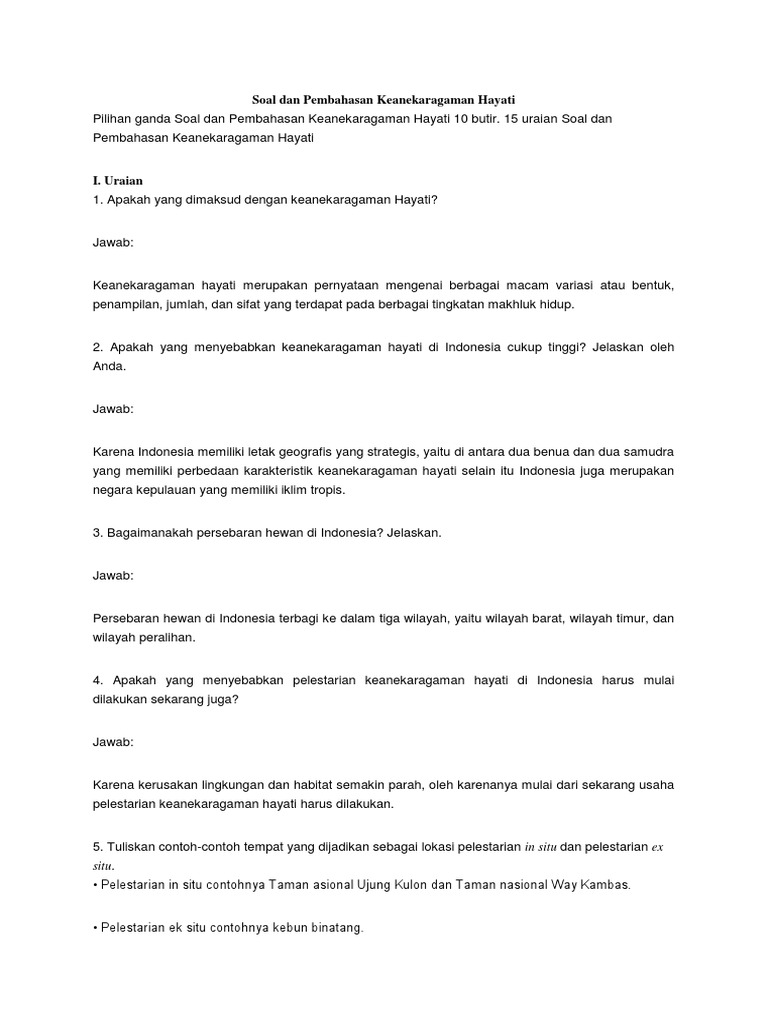Contoh soal keanekaragaman hayati. Soal biologi bab keanekaragaman hayati keanekaragaman hayati merupakan salah satu materi mata pelajaran biologi yang dipelajari di smama. Contoh keanekaragaman hayati tingkat ekosistem adalah pohon kelapa yang lebih cocok tumbuh di daerah pantai dan pohon aren yang tumbuh di daratan tinggi. Contoh soal tingkat keanekaragaman hayati gen jenis ekosistem di indonesia adalah halaman kumpulan soal dengan materi keanekaragaman hayati untuk tingkat smamasederajat dengan peminatan ipa yang disesuaikan dengan kisi kisi un 2020berdasarkan kisi kisi un terbaru tingkat smamasederajat materi keanekaragaman hayati termuat dalam satu level kognitif yaitu level kognitif. Latihan soal keanekaragaman hayati nomor 7 pembahasan. Keanekaragaman ekosistem di dunia ada berbagai macam seperti ekosistem hutan hujan tropis hutan gugur padang rumput padang pasir dan sebagainya sedangkan ekosistem perairan seperti ekosistem air tawar air payau dan laut. Siapa tahu bisa membantu anda saat ujian nanti.