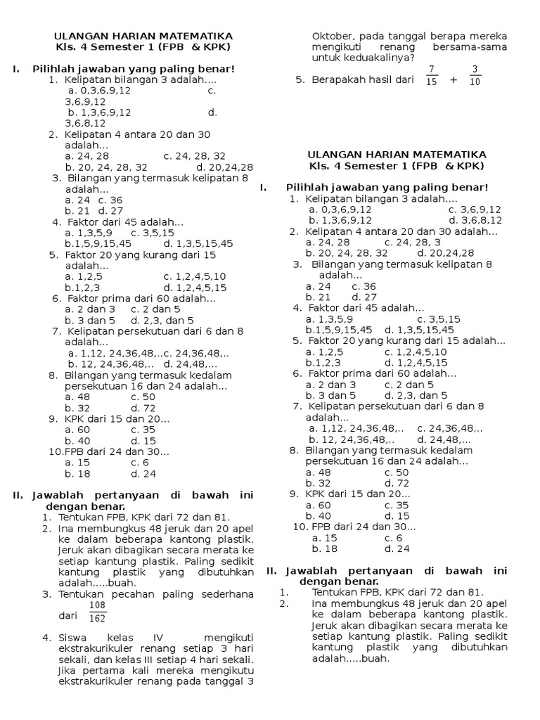 Kunci jawaban soal ulangan harian matematika kelas 4 sd bab 3 bangun 3 kpk dan fpb a. 8 dan 24 6. 12 dan 24 4. Contoh soal kpk dan fpb beserta kunci jawaban soal kpk dan fpb yang kami bagikan ini sangat sesuai dengan materi mtk yang dipelajari di mulai dari kelas 4 5 dan 6. Hal ini menyesuaikan dengan kurikulum yang digunakan. Jika anda sedang menggunakan kurikulum 2013 revisi maka materi kpk dan fpb ini dipelajari pada kelas 4 sd.
