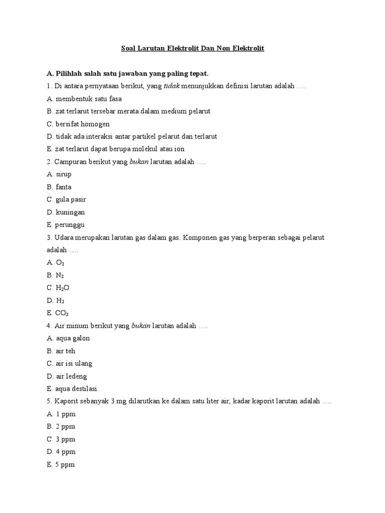 Contoh soal larutan elektrolit. Demikian pembahasan pengertian sifst koligatif larutan beserta rumus rumusnya dan beberapa contoh soal dan jawaban sifat koligatif larutan mohon maaf jika ada kesalahan dalam pembahasan dan penulisan. 15 contoh soal tentang efek rumah kaca ipa kelas 7 dan jawabannya. Suatu larutan jika diuji dengan alat penguji elektrolit menunjukan adanta nyala lampu yang terang dan timbulnya gelembung gas. Larutan elektrolit kuat merupakan larutan yang molekulnya terurai mejadi sebuah ion ion. Soal dan pembahasan larutan elektrolit dan non elektrolit. Percobaan pengujian larutan dengan alat uji elektrolit didapatkan hasil sebagai berikut.