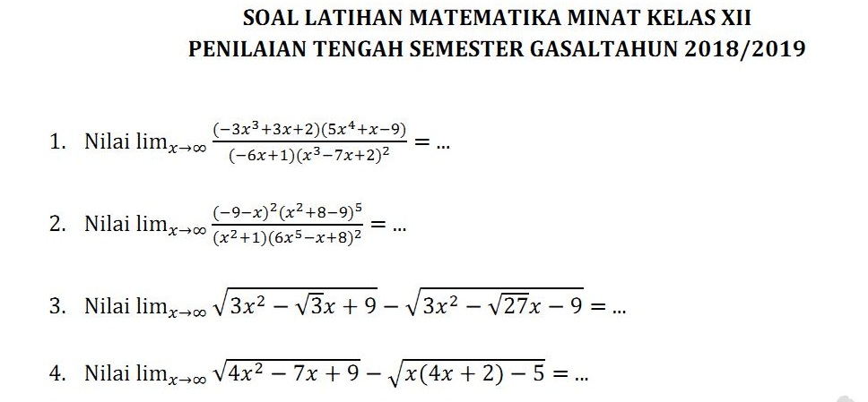 Soal matematika kelas 11. Pelajari materi latihan soal dan pembahasan matematika wajib kelas 12 sma kurikulum 2013. Silakan download soalnya dalam bentuk pdf di sini. Karena soal ini sering muncul pada berbagai tes atau ujian nasional usbn ataupun unbk. Penulis mengarsipkannya sebagai bahan referensi untuk belajar. Berikut ini merupakan soal disertai pembahasannya ulangan umum matematika kelas xii semester ganjil tahun ajaran 20172018 smkn 3 pontianak yang penulis arsipkan sebagai bahan referensi untuk belajar.