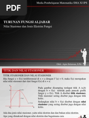 Dari grafik diatas dapat dilihat bahwa fa adalah nilai stasioner di x a dan fb adalah nilai stasioner di x b dimana turunan pertama di titik titik tersebut bernilai nol. Soal 1 jika x₁ dan x₂ merupakan akar persamaan x² a 1x a 0. Nilai stasioner dari x₁³ 3x₁x₂ x₂³ dicapai untuk a. Dalam matematika terutama di bidang analisis titik stasioner atau kritis dari suatu fungsi yang dapat diturunkan. Nilai balik minimum 3. Jika koefisien positif maka itu adalah nilai minimum.