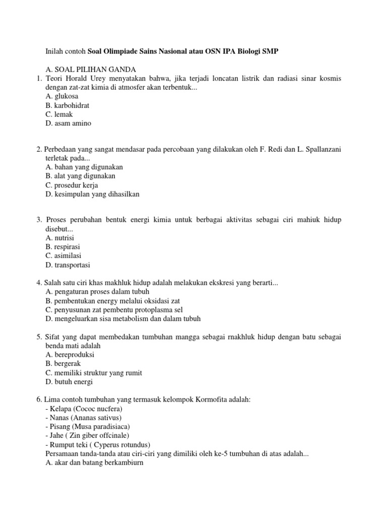Jadi selain dijadikan bahan pembelajaran soal ini bisa sobat jadikan prediksi tentang apa yang akan dikeluarkan pemerintah pada tahun mendatang. Inilah contoh soal olimpiade sains nasional atau osn ipa biologi smp a.