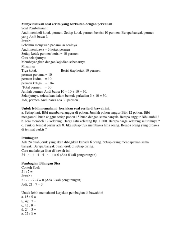 Dan berikut ini adalah beberapa contoh soal perkalian untuk anak kelas 1 sd dan bisa untuk membuat anak anak itu lebih memahami soal soal yang akan dipelajari disekolah mereka. Perkalian dapat juga sebagai penjumlahan berulang. Bilangan 37482 jika dibulatkan ke ratusan terdekat maka akan menjadi. Adapun kesulitan yang biasanya siswa alami saat menyelesaikan soal cerita matematika adalah mengintruksikan soal yang diketahui. Bagi kalian yang kurang mehami pembagian maka ingatlah fakta perkalian. Soal uh operasi hitung perkalian dan pembagian.
