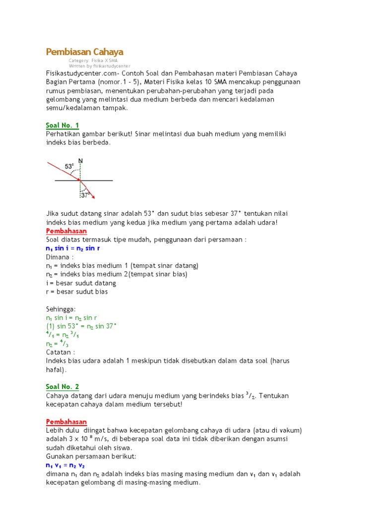 Contoh soal pembiasan cahaya. Artikel ini membahas tentang pembiasan cahaya pada prisma optik rumus sudut pembias prisma persamaan sudut deviasi serta contoh soal dan pembahasannya lengkap. Contoh soal dan pembahasan materi pembiasan cahaya bagian pertama nomor1 5 materi fisika kelas 10 sma mencakup penggunaan rumus pembiasan menentukan perubahan perubahan yang terjadi pada gelombang yang melintasi dua medium berbeda dan mencari kedalaman semukedalaman tampak. Artikel ini membahas tentang kumpulan contoh soal beserta jawaban mengenai pembiasan cahaya pada air lensa cembung lensa cekung kaca planparalel bidang sferis prisma pemantulan sempurna sudut deviasi minimum dan indeks bias lengkap bagian 1. Menentukan sifat cahaya pemantulan cahaya menentukan sifat bayangan yang dibentuk oleh cermin atau lensa menentukan kekuatan lensa menentukan proses pembentukan bayangan hukum pemantulan dan pembiasan cahaya dan manfaat cermin atau lensa dalam kehidupan sehari hari. Pemantulan cahaya pengertian rumus sifat macam dan cirinya dalam kehidupan sehari hari kita dapat melihat proses pemantulan cahaya seperti kita berdiri didepan cermin maka kita akan melihat bayangan pada cermin tersebut hal ini dikarenakan adanya pemantulan cahayatidak hanya cermin tetapi juga sepion pada sepion cermin yang kita gunakan adalah cermin cembung dengan menggunakan. Nah agar lebih dapat memahami dan mengerti simak pemaparan selengkapnya dibawah ini.