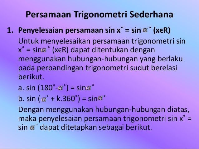 Persamaan trigonometri sederhana terdiri dari persamaan untuk sinus cosinus dan tangen. Rumus untuk menyelesaikan persamaan trigonometri sederhana seperti berikut. Tengok dulu 3 kelompok rumus penyelesaian persamaan trigonometri berikut. Penyelesaian persamaan ini dengan cara mencari seluruh nilai sudut sudut x sehingga persamaan tersebut bernilai benar untuk daerah asal tertentu. Dalam pembahasan ini terdapat beberapa bentuk bentuk persamaan trigonometri yang mana pelajaran ini pasti keluar di materi di bangku sekolah. Berikut ini kami sajikan contoh soal persamaan trigonometri kelas 11 dan pembahasannya secara lengkap untuk anda pelajari.