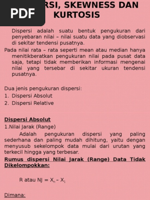 Contoh soal skewness dan kurtosis. Ukuran kemencengan kurva skewness. Untuk dapat menggambarkan karakteristik dari suatu distribusi data kita menggunakan konsep konsep lain yang dikenal sebagai kemiringan skewness dan keruncingan kurtosis. Karena γ 2 0 diperkirakan distribusi ini lebih tumpul dari distribusi normal. Tingkat kemiringan dan tingkat keruncingan kurva skewness dan kurtosis at bullet tingkat kemiringan kurva skewness. Variansi sudah dihitung pada penyelesaian contoh 1 yaitu sehingga. Momen kemiringan dan kurtosis momen kemiringan kurtosis.
