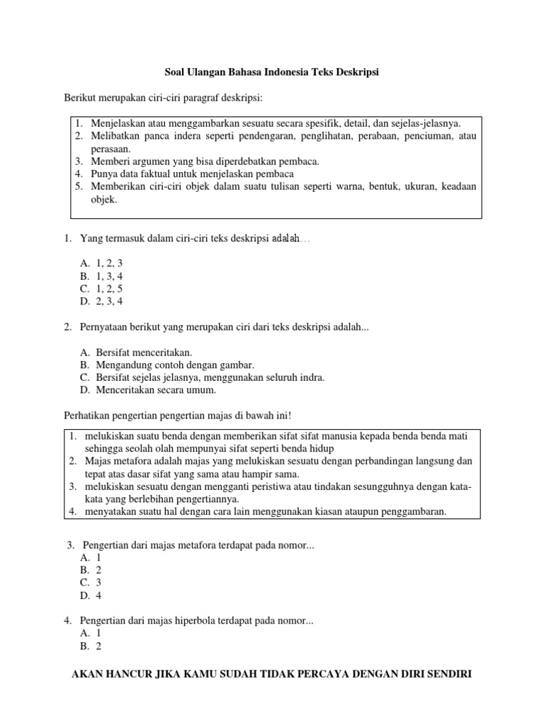 Kantor kelurahan menghadap arah depan mushola. Permenpan yang mengatur guru juga menyediakan soal latihan ujian nasional un unbk soal latihan ujian sekolah us soal latihan penilaian akhir semester soal pas. Teks deskripsi membuat pembaca seolah masuk ke dalam suasana. Teks deskripsi pembahasan materi kali ini adalah mengenai pengertian contoh struktur tujuan dan ciri ciri teks deskripsi yang akan dibahas secara lengkap. Silahkan kalian simak penjelasan lengkapnya dibawah ini. Contoh soal bahasa indonesia kelas 7 semester 1 ganjil berilah tanda silang x pada huruf a b c atau d di depan jawaban yang benar.