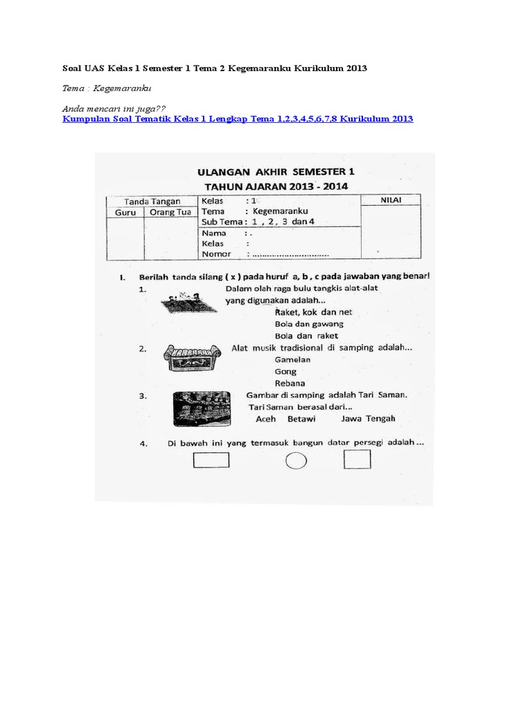 Bank Soal Kurikulum 2013 Kelas 1 Semester 1 Revisi Tahun 2017