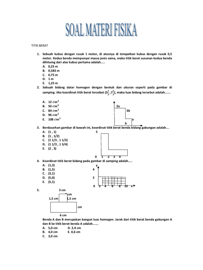 Terimakasih sudah mengunjungi idschooldotnet semoga bermanfaat. Kumpulan soal dan pembahasan titik berat benda posted by edutafsi on 02 april 2015 610 am titik berat gabungan dari benda benda teratur yang mempunyai berat massa luas atau volume tertentu dapat dinyatakan dalam koordinat cartesian xy.