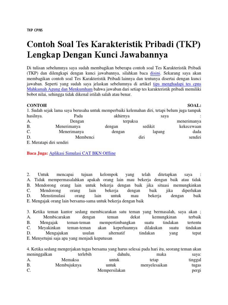 Contoh soal full pembahasan tes karakteristik pribadi tkp kunci jawaban tips dan trik cat ujian cpns 2018 contoh soal full pembahasan tes karakteristik pribadi tkp kunci jawaban tips dan trik cat ujian cpns video tentang cara mengerjakan soal cpns tes karateristik pribadi tkp yang sering keluar di ujian cpns 2018. Download soal tes cpns tkp 2018 2019.
