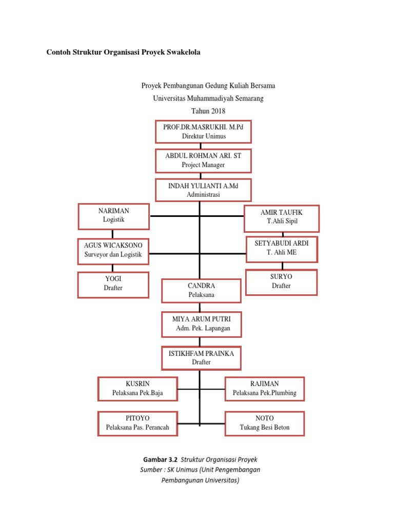 Contoh struktur organisasi proyek. Tahapan proyek yang diberlakukan pada. Sebuah proyek pekerjaan yang relatif sederhana dimungkinkan dapat dikerjakan tanpa adanya penyusunan struktur organisasi. Struktur organisasi ini termasuk struktur organisasi fungsional karena organisasi fungsional adalah suatu bentuk organisasi yang didalamnya terdapat hubungan yang tidak terlalu menekankan kepada hierarki struktural akan tetapi lebih banyak didasarkan pada sifat dan jenis pekerjaan yang akan dilakasanakan. Hal ini berguna agar mengetahui hak dan kewajiban serta batasan dari setiap jabatan. Bentuk struktur organisasi ini umumnya digunakan oleh perusahaan yang berskala besar ataupun perusahaan perusahaan multinasional. Contoh struktur organisasi matriks.