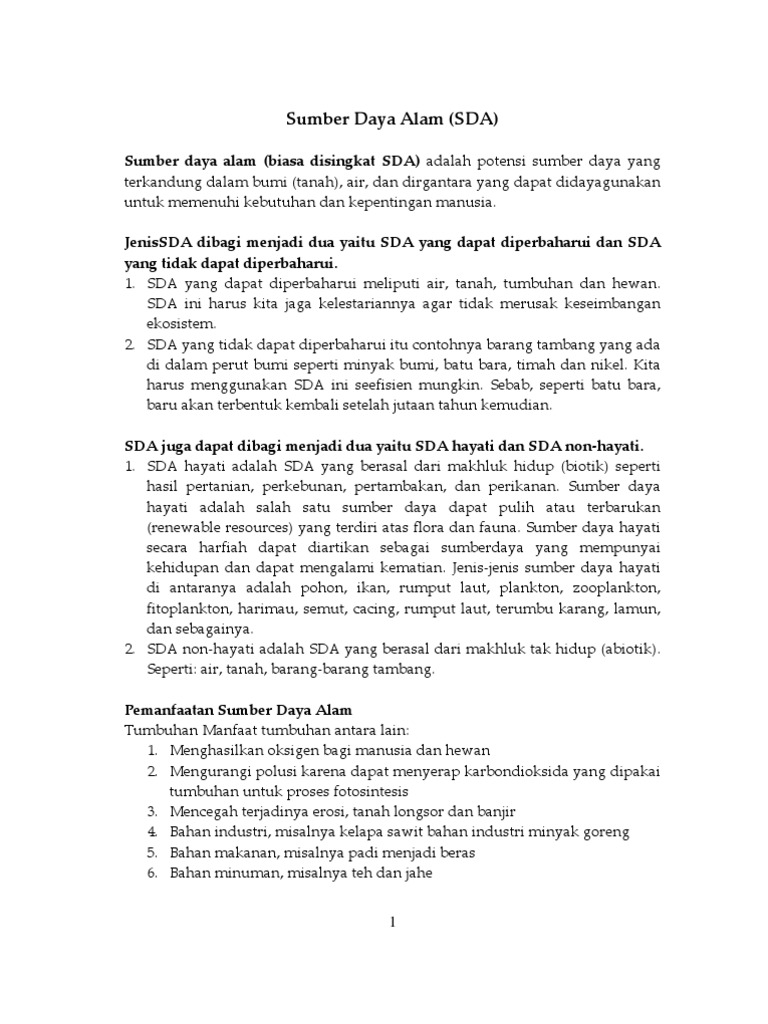 Contoh sumber daya alam yang dapat diperbaharui dan tidak dapat di perbaharui. Pendapat lain mengatakan definisi sumber daya alam sda adalah semua bahan atau zat seperti mineral hutan air serta tanah subur yang terdapat di alam dan dapat digunakan untuk keuntungan ekonomi bagi manusia. Banyaknya sda yang indonesia miliki menjadi salah satu daya tarik negara asing untuk bekerjasama dalam kegiatan ekonomi ada yang membutuhkan untuk bahan baku industri di negaranya ada juga yang tertarik untuk melakukan investasi. Seperti yang telah dikemukakan sebelumnya bahwa sumber daya alam yang dapat diperbaharui adalah sumber daya alam yang ketersediaannya di muka bumi ini akan selalu ada sehingga manusia tidak perlu khawatir saat menggunakannya karena tidak akan habis. Sumber daya alam yang dapat diperbaharui bumi merupakan satu satunya planet yang terdapat kehidupan di dalamnya. Kedua sumber daya alam tersebut memiliki andil besar terhadap keberlangsungan hidup manusia. Sumber daya alam yang tidak dapat diperbaharui merupakan sumber daya alam yang apabila telah dimanfaatkan tidak dapat digunakan lagi.