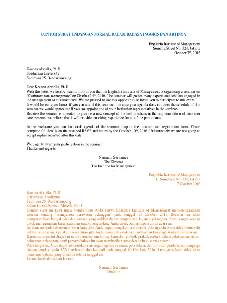 A formal letter pada bagian writing task 1 dalam hellip. Contoh surat resmi dalam bahasa inggris beserta artinya terbaru apakah sahabat sedang mencari contoh penulisan surat resmi dalam bahasa inggris. Sebelumnya kbi telah membahas cara mudah menulis surat dan email dalam bahasa inggrispada kesempatan ini kbi akan memberikan contoh sederhana surat resmi formal letter dalam bahasa inggristentunya surat resmi digunkan di instansi instansi resmi seperti perusahaan sekolah pemerintah. Surat sendiri pun memiliki dua jenis atau macam yaitu surat formal dan surat non formal. Continue reading cara. Jika kita mengadakan sebuah kegiatan formal dan ingin mengundang seseorang atau bahkan institusi dalam bahasa inggris.
