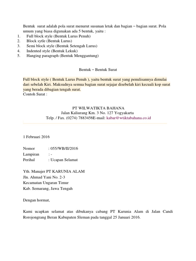 Bentuk bentuk surat dan contohnya full block style atau bentuk lurus penuh. Contoh surat full block style bentuk surat ini disebut juga dengan surat bentuk lurus penuh. Untuk lebih jelasnya perhatikan contoh soal dan jawaban surat bentuk lurus penuh full block style berikut ini. Untuk bentuk surat bentuk lurus penuh full block style dapat dilihat dari penulisan bagian bagian surat yang semuanya dimulai dari kiri. Agar lebih jelas bisa dilihat dalam. Untuk penulisan bagian bagian surat semuanya dimulai dari kiri.