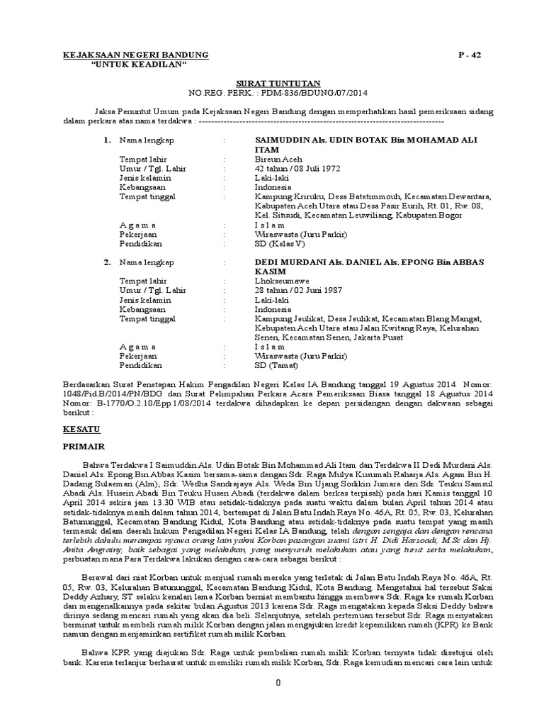 40 tahun 29 september 1978. Mohon maaf apabila terdapat kesamaan nama tempat ataupun informasi di dalamnya karena semua surat hanya bersifat percontohan saja tanpa ada maksud apapun. Bahwa terdakwa reki kurniawan m arief setiawan sony hidayat pada hari rabu tanggal 1 april 2012 sekitar pukul 1700 wib bertempat di kost beruang jl. Pemilihan bentuk surat dakwaan apakah disusun secara tunggal alternatif subsidairitas ataupun kombinasi merupakan kewenangan penuh dari tim penuntut umum. November 12 2015 surat. Cempaka sari rt2 rw2 sekaran gunungpati telah melakukan penganiayaan yang telah direncanakan terhadap adhitya wildana dan joko susilo perbuatan tersebut dilakukan terdakwa dengan cara sebagai berikut.