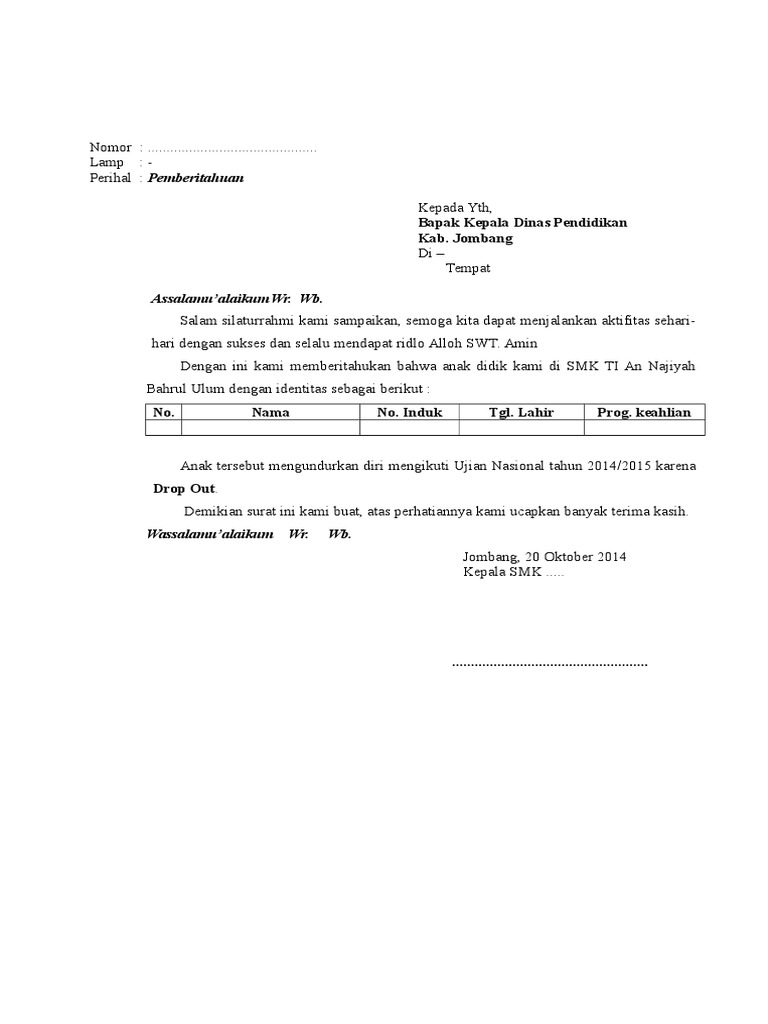 Contoh surat drop out. Contoh surat drop out sekolah. Surat keputusan rektor yang men drop out kemahasiswaan peserta didik universitas swasta dapat menjadi objek gugatan di pengadilan tata usaha negara. Surat keputusan ketua stmik raharja tentang penetapan daftar mahasiswa drop out semester ganjil ta. Untuk itu anda perlu melihat lagi pada peraturan akademik masing masing perguruan tinggi. Softgaleri adalah blog yang berbagi informasi kode administrasi dalam surat menyurat administrasi aplikasi dan administrasi guru yang mana file berikut ini adalah kumpulan dari berbagi sumber tentang contoh surat drop out sekolah yang bisa bapakibu gunakan dan diunduh secara gratis dengan menekan tombol download biru dibawah ini.