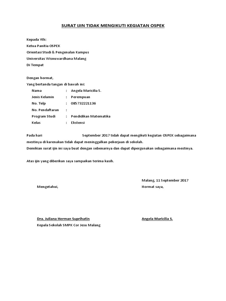 Salah satu kewajibannya adalah untuk masuk setiap jadwal mata kuliah sesuai dengan jadwal yang sudah ditentukan. Surat izin adalah salah satu surat yang berisi tentang keterangan bahwa seorang yang membuat surat tersebut untuk meminta izin pada sebuah alasan melakukan sesuatu di luar tugas wajib yang dilakukan. Contoh surat izin tidak masuk kuliah karena tugas kantor 2 surat izin tidak masuk kuliah. Demikian contoh surat izin kuliah yang bisa anda gunakan untuk meminta izin pada pihak kampus tau dosen wali maupun dosen pengampu saat berhalangan untuk mengikuti kegiatan perkuliahan. Contoh surat izin tidak masuk kuliah. Sayangnya mahasiswa jaman sekarang kadang menggap enteng masalah absensi perkuliahan.