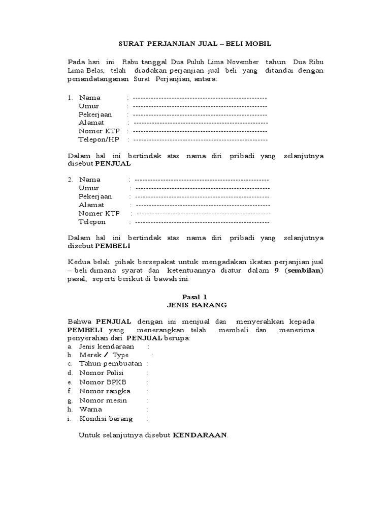 4 contoh surat perjanjian jual beli motor untuk penjual dan pembeli surat perjanjian jual beli motor merupakan surat yang berisi informasi tentang transaksi dan ketentuan ketentuan yang ada di dalam proses transaksi jual beli tersebut seperti menjelaskan objek dan biaya yang dikeluarkan untuk membeli objek yang dijualbelikan. 10 contoh surat perjanjian jual beli rumah sederhana surat perjanjian oktober 24 2019 2139 contoh surat perjanjian jual beli adalah surat yang dibuat oleh pihakpihak yang ingin melakukan transaksi jual beli harta benda berharga dengan nilai harga yang cukup besar seperti kendaraan bangunan tanah perhiasan dan barangbarang berharga lainnya. Setelah mencantumkan identitas lengkap penjual pihak pertama dan pembeli pihak kedua alamat lengkap dan posisi lahan yang tepat juga perlu untuk dijabarkan. Surat perjanjian jual beli merupakan sebuah surat yang dibuat oleh seorang penjual dan pembeli untuk menjelaskan hak dan kewajiban yang tidak boleh dilanggar oleh kedua belah pihak dalam suatu urusan jual beli. Dalam proses transaksi jual beli rumah maupun jual beli apapun yang memiliki nilai jual tinggi sebaiknya digunakan contoh surat perjanjian jual beli rumah dengan 11 pasal berikut ini. Contohnya adalah pada proses jual beli tanah.