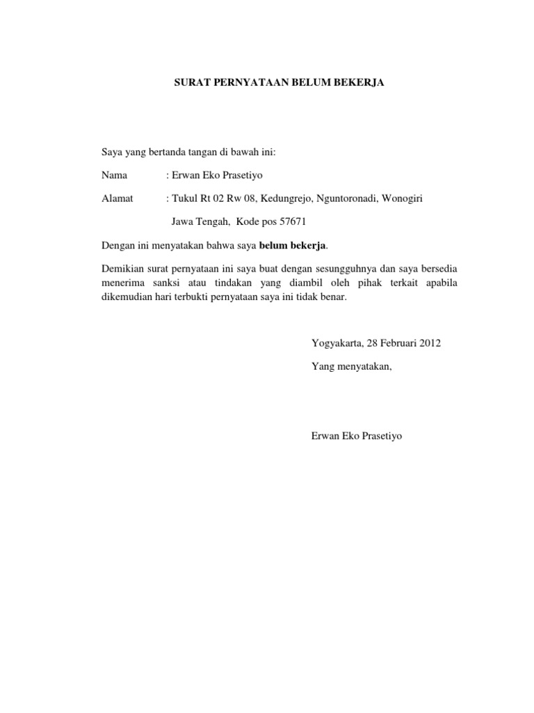Berikut saya buatkan contoh surat keterangan belum bekerja yang saya gunakan untuk mendaftar ke bprtik kominfo ciputat tangerang selatan. Contoh surat keterangan kerja sebuah surat keterangan kerja sangatlah dibutuhkan untuk memberikan penjelasan kepada seseorang instansi maupun perusahaan tempat bekerja agar dapat menerangkan memberikan penjelasan tentang suatu hal yang terkait misalnya kecakapan prilaku maupun lama pengabdian. Tempat tanggal lahir. Fungsi utama dari penerbitan surat ini adalah untuk menjelaskan dan membenarkan sebuah fakta yang dibutuhkan sebagai data administrasi. Surat keterangan belum bekerja yang bertanda tangan dibawah ini nama. Lihat perbedaannya saya terangkan di pengertian surat keterangan.