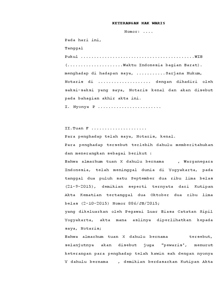 Naviriorg berikut ini adalah contoh surat perjanjian atau akta keterangan hak waris. Merupakan akta otentik yang dibuat olehdi hadapan pejabat umum yang berwenang sesuai pasal 1868 kuhperdata. Untuk keterangan waris wni pribumi karena keterangan waris cukup dibuat di bawah tangan saja maka aktanya merupakan surat di bawah tangan untuk keterangan waris wni tionghoa. Surat keterangan ahli waris merupakan surat keterangan yang isinya adalah pernyataan bahwa pihak pembuat surat keterangan ahli waris tersebut memang benar benar berhak atas segala sesuatu yang diwariskan oleh seseorang. Keterangan waris adalah surat yang dibuat olehdi hadapan pejabat yang berwenang yang isinya menerangkan tentang siapa saja ahli waris dari seseorang yang sudah meninggal dunia. Cara buat dan contoh surat keterangan bebas narkoba tanpa adanya surat keterangan ahli waris seseorang yang merupakan ahli waris tidak bisa mengambil dan menguasai harta warisan.