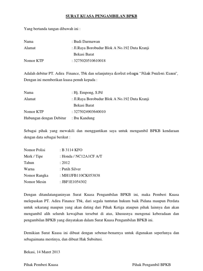 Buat kamu yang mungkin tidak ingin repot membuat surat kuasa dari awal berikut ini saya sertakan contoh surat kuasa pengambilan bpkb berbentuk word doc yang bisa kamu download dan edit untuk keperluanmu. Jika anda membeli kendaraan bermotor dari showroom atau dealer maka tentu akan mendapatkan bpkb sebagai bukti kepemiliki anda atas kendaraan bermotor tersebut. Contoh surat kuasa pengambilan bpkb sudah menjadi kewajiban dan keharusan jika dokumen bpkb motor atau mobil yang sudah jadi untuk diambil. Di bawah ini kami akan memberikan sebuah contoh surat yang berisi tentang informasi bahwa pihak pertama telah memberikan kuasa kepada seseorang yang ia tunjuk atau pihak kedua untuk melakukan pengambilan bpkb motor yamaha. Sulamun tempattanggal lahir. Mujiono tempattanggal lahir.