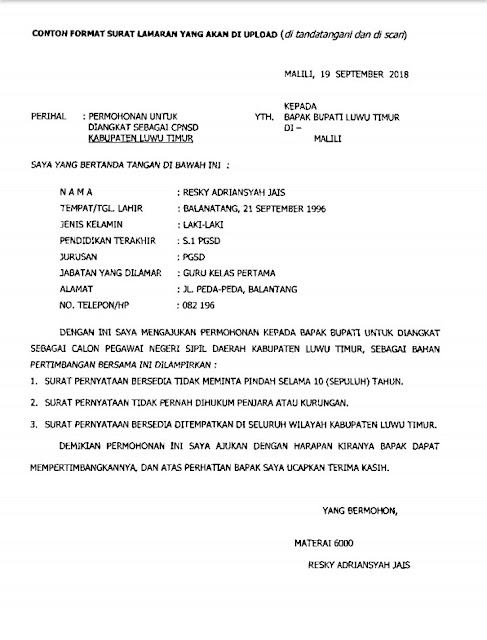 Silahkan dibaca melalui link ini karena terdapat juga informasi penting lainnya. Sebelumnya memang sudah saya bagikan untuk contoh surat pernyataan cpns guru. Pengiriman berkas lamaran 1. Seperti apa contoh surat lamaran kerja cpns. Semoga bermanfaat bagi anda yang membutuhkan dan semoga sukses pada pendaftaran cpns kemenristekdikti tahun ini. Pengiriman berkas lamaran diatur sebagai berikut.
