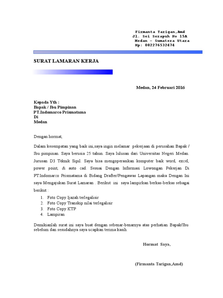 15 contoh surat lamaran kerja indomaret untuk berbagai posisi indomaret merupakan salah satu perusahaan retail terbesar di indonesia. Indomaret bahkan sudah memiliki ribuan toko yang tersebar di setiap kota di indonesia. Perusahan tersebut memiliki banyak toko yang tersebar di seluruh wilayah di indonesia seperti yang juga anda kenal yakni indomaret dan alfamart. Contoh surat lamaran kerja di indomaret indomaret merupakan toko sembako yang banyak kita temui di berbagai daerah di indonesia.