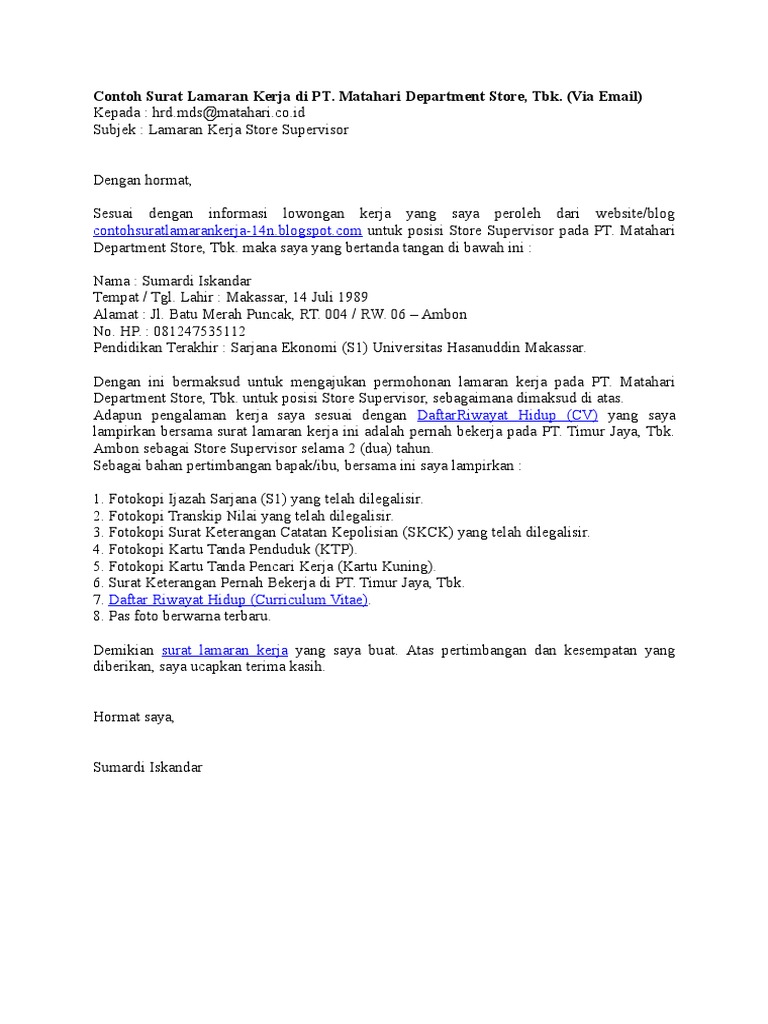 Di internet ada banyak sekali paduan contoh surat lamaran kerja yang baik dan benar serta sesuai dengan kriteria kriteria yang seharusnya. Kepala bagian personalia the blitz jl. Contoh surat lamaran kerja di matahari. Mungkin terdapat jutaan artikel di internet yang menyediakan panduan bagaimana cara membuat surat lamaran pekerjaan yang disertai contoh surat lamaran pekerjaan baik itu surat lamaran kerja untuk melamar ke perusahaan maupun surat lamaran pekerjaan. Contoh surat lamaran kerja di perusahaan seringkali dicari oleh para pencari kerja yang ingin mengajukan lamaran pekerjaan di perusahaan perusahaan yang ada di indonesia. Hormat saya yulischa silahkan di edit sesuai kebutuhan anda surat lamaran kerja ke matahari department store 2020 sehingga menghasilkan surat lamaran kerja ke matahari department store yang baik dan benar.