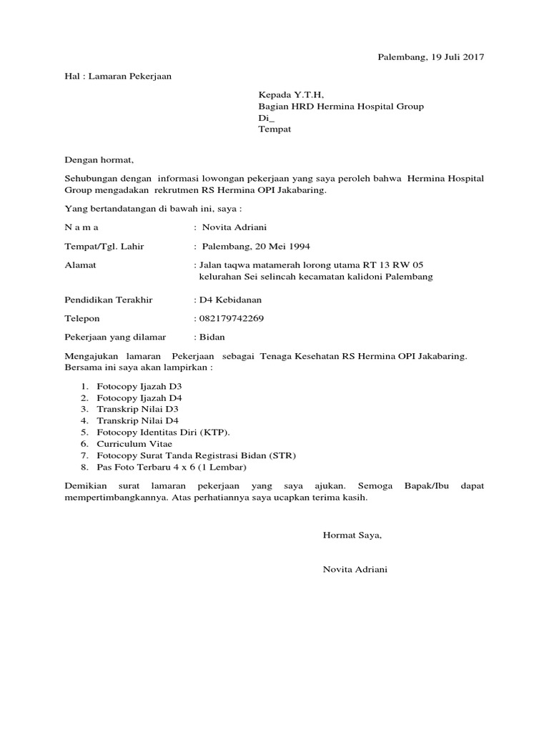 Contoh surat lamaran kerja di rumah sakit adalah merupakan postingan yang akan saya bahas pada kesempatan yang berbahagia ini untuk kamu para pengunjung setia semuanya khususnya bagi kamu yang ingin melamar pekerjaan di rumah sakit tentunya akan membutuhkan referensi dalam membuat surat lamaran kerja di rumah sakit maka tetaplah berada di halaman ini karena disini saya akan memberikan. Pada kesempatan kali ini kita akan membahas tentang contoh surat lamaran kerja di rumah sakit. June 23 2015 sudah sejak lama mindset yang tertanam di benak orang indonesia bahwa bekerja di rumah sakit tentunya sebagai salah satu tenaga kesehatan merupakan hal yang menjanjikan di bidang finansialterlepas dari akibat pekerjaan yang cukup riskan karena berkaitan erat dengan nyawa seseorang. Menjadi sebuah bagian dari rumah sakit tidak lah mudah harus menghabiskan puluhan hingga ratusan juta untuk belajar. Baik itu jurusan keperawatan jurusan kebidanan sampai dengan jurusan kedokteran. Lampiran yang dibutuhkan jika anda sedang bersiap untuk mengirimkan lamaran di rumah sakit pastikan anda mempersiapkan lampiran berikut ini.