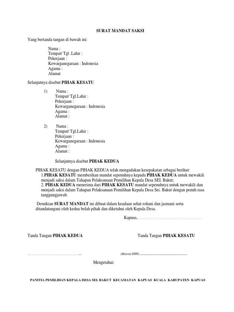Contoh surat mandat saksi pilkades pdf oleh karena pentingnya peran dan tugas saksi dalam pilkades maka bimbingan teknis bimtek kepada para saksi sangat perlu dilakukan sebagai panduan dan pembekalan bagi mereka. Contoh surat mandat saksi pilkadesmenyerahkan surat mandat dari partai yang ditandatangani oleh ketua dan sekretaris partai di tingkat kabupaten kepada petugas kpps satu hari sebelum hari pemungutan suara. Surat pernyataan belum pernah menjabat kades selama 3 periode. Contoh surat tugas kerja. Bukti tanda terima berkas pendaftaran bakal calon kades jagamukti sdr. Download 2075 kb contoh surat mandat saksi pemilu presiden download.