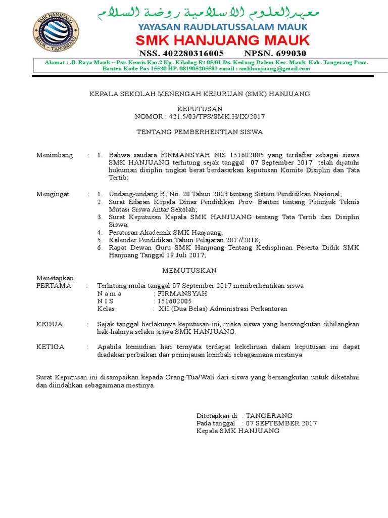 Contoh sk pemberhentian kepala sekolah adalah surat yang berisi keputusan ketua yayasan tentang pemberhentia kepala sekolah madarasah. Namun untuk kеgiаtаn уаng bеrѕifаt fоrmаl ѕереrti sekolah kеrjаѕаmа bisnis аntаr реruѕаhааn osis pastinya mеnggunаkаn ѕurаt rеѕmi kаrеnа. Menulis surat pemberhentian kerja ini tidaklah sulit dan ada banyak contoh surat yang bisa anda jadikan bahan referensi. Berikut dikongsikan contoh surat berhenti kerja terbaik yang mudah dan ringkasperkongsian contoh surat rasmi notis berhenti kerja resignation letter adalah dalam bahasa malaysia dan inggeris yang merangkumi notis perletakan jawatan samada 24 jam ataupun sebulan. Pemecatan atau pemutusan kerja tersebut disebabkan oleh karyawan atau karena perusahaan sudah tidak membutuhkan karyawan tersebut untuk bekerja di perusahaan mereka. Contoh surat keputusan pemberhentian kepala sekolah.
