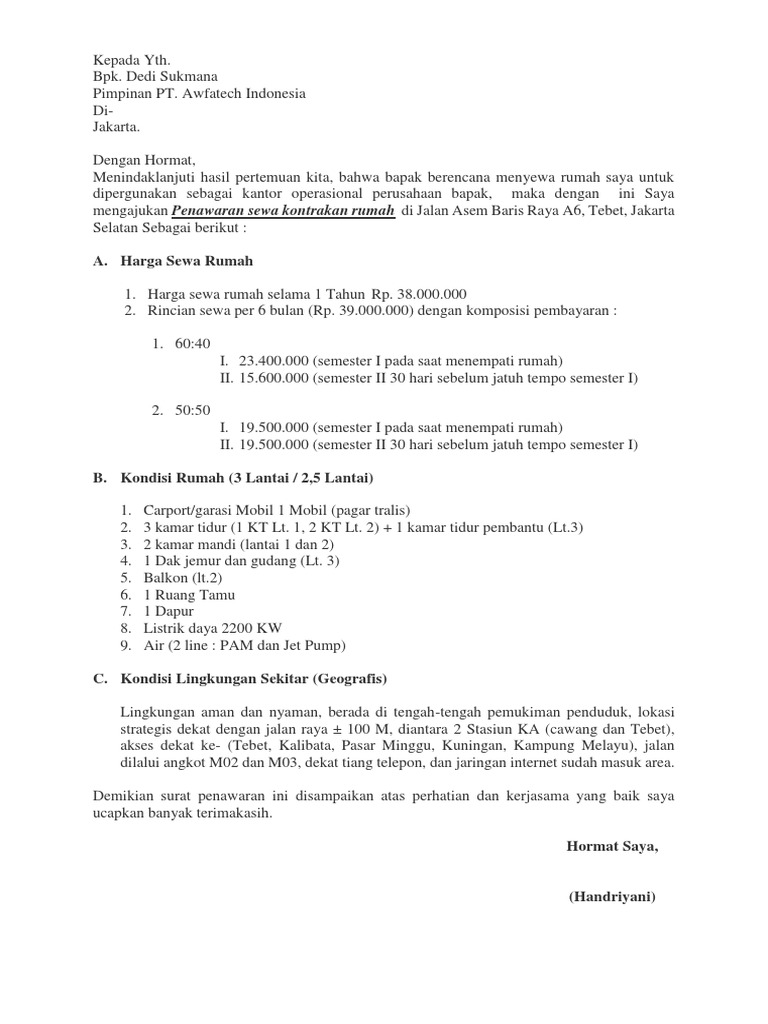 Inilah pembahasan lengkap terkait contoh surat penawaran sewa gedung kantor. Jumlah uang tersebut diatas diterima oleh pihak pertama dan surat penawaran ini berlaku juga sebagai kwitansi tanda penerimanya serta sebagai bukti pada pelunasannya nanti oleh pihak kedua. Yang bertanda tangan dibawah ini. Di dalam sebuah surat perjanjian tentu terkandung diantaranya pihak yang terlibat dalam perjanjian obyek yang disewa dalam hal ini ruko atau kios serta hak dan kewajiban yang harus dipatuhi. 6 hal penting dalam kontrak surat perjanjian sewa rumah lamudi pun mengutip beberapa bagian penting dari contoh surat perjanjian sewa rumah yang dapat anda unduh dari link di akhir artikel ini. Adapun penawaran yang kami ajukan adalah sebagai berikut.