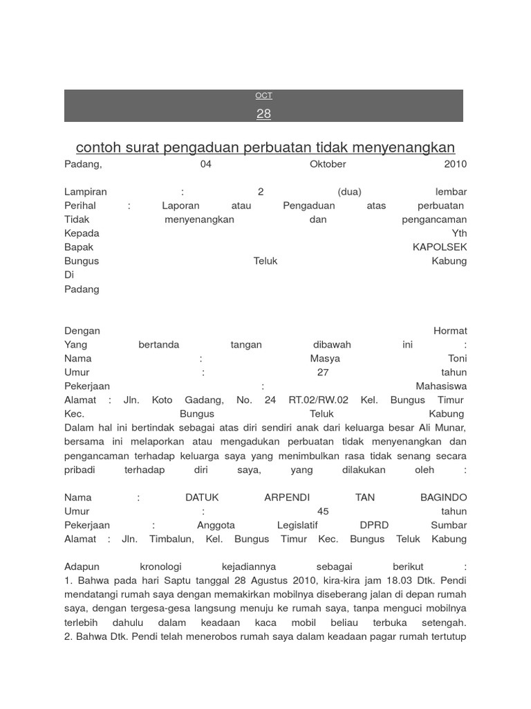 Contoh surat laporan pengaduan ke polisi. Contoh surat laporan pengaduan ke polisi sebagai aparat memberikan pelayanan serta pelindungan hukum kepada masyarakat maka jika anda merasa telah dirugikan oleh seseorang atau telah menjadi korban tindak kriminal anda bisa melaporkan perkara tersebut kepada pihak kepolisian. Orang yang melakukan penghinaanpencemaran nama baik terhadap anda dapat anda tuntut jika orang tersebut mengetahui benar benar bahwa apa yang dia adukan tersebut tidak benar. Contoh surat pengaduan atas pencemaran nama baik in english contoh surat pengaduan atas pencemaran nama baik jokowi contoh surat pengaduan atas pencemaran nama baik. Contoh surat surat wasiat adalah surat pernyataan yang dibuat seseorang berupa pesan atau amanat yang ingin dilaksanakan saat telah meninggal dunia. Barang siapa sengaja menyerang kehormatan atau nama baik seseorang dengan menuduhkan sesuatu hal yang maksudnya terang supaya hal itu diketahui umum diancam karena pencemaran dengan pidana penjara paling lama sembilan bulan atau pidana denda paling banyak empat ribu lima ratus rupiah.