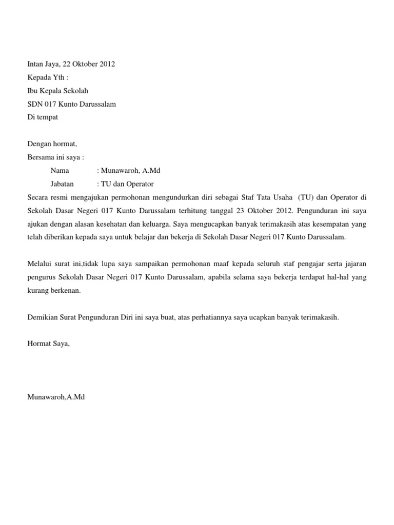 Contoh surat pengunduran diri doc. Contoh surat resign guru dari sekolah. Kepala smk negeri 2 kulon progo jl. Contoh surat pengunduran diri dari jabatan surat pengunduran diri sering kali menjadi suatu hal membuat banyak orang merasa dilematisbukan hanya karena kenangan atau kebersamaan yang telah terjalin diperusahaan saja surat ini tidak sama dengan contoh surat lamaran kerja karena lebih menguras emosi. Jakarta 30 maret 1979 jabatan. Sebagai guru anda harus membuat surat pengunduran diri sebaik mungkin agar tetap terlihat baik dan professional di depan mata atasan dan guru guru lainnya.