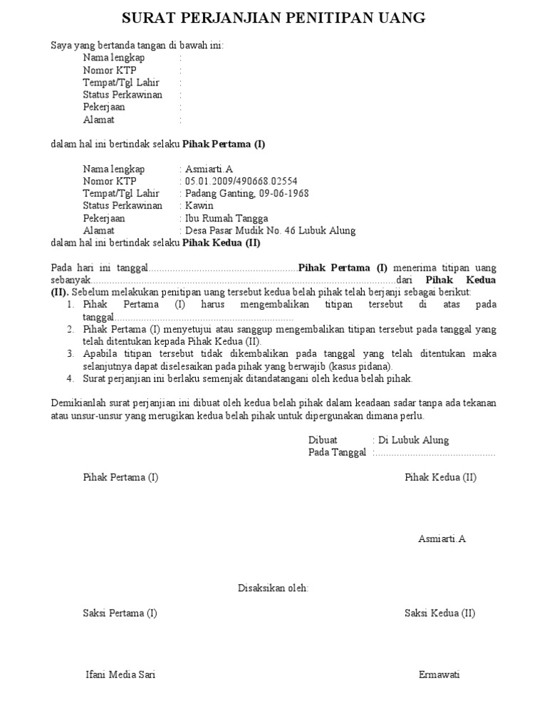 Tetapi hal ini tentunya jika situasi dan kondisi yang. Contoh surat perjanjian hutang piutang lengkap. Contoh surat pernyataan penitipan uang by prim at 616 pm 4 share on facebook share on twitter. Pernyataan yang diberikan secara lisan sering kali sulit untuk diingat dengan secara rinci. Doc surat perjanjian penitipan uang bryananta bayu. Surat perjanjian hutang piutang dibawah ini bisa anda modifikasi isi dan klausanya sesuai kondisi dan kesepakatan antara pihak yang mengikatkan diri dalam perjanjian hutang piutang tersebut.