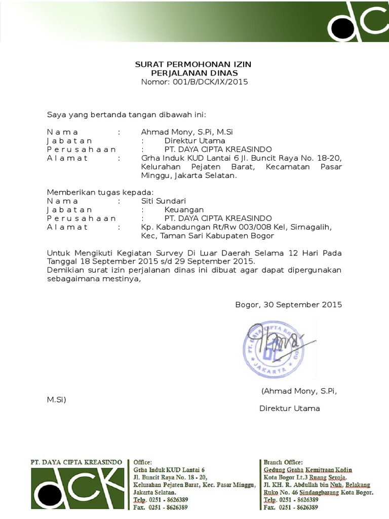 Selain instansi pemerintah perjalanan dinas seringkali juga dilakukan oleh para perusahaan. Contoh surat perintah perjalanan dinas. Dari definisi diatas dapat diketahui bahwa surat dinas hanya dikeluarkan pada waktu dan kondisi tertentu oleh sebuah instansi. Dan untuk memerintahkan bawahan dalam melakukan perjalanan dinas seorang atasan pun bisa menggunakan surat perintah perjalanan dinas atau sppd. Surat ini sangat penting dan diperlukan sebagai keterangan ketika pegawai melakukan perjalanan dinas atau keprluan perusahaan. Nah dibawah ini adalah salah satu contoh dari tata penulisan yang baik dan benar dalam sebuah surat perjalanan dinas dimana terjadi di sebuah perusahaan swasta misalkan dikantor kantor atau pt swasta lainya dimana surat perintah perjalanan akan dikeluarkan pada umumnya oleh seorang direktur pimpinan.