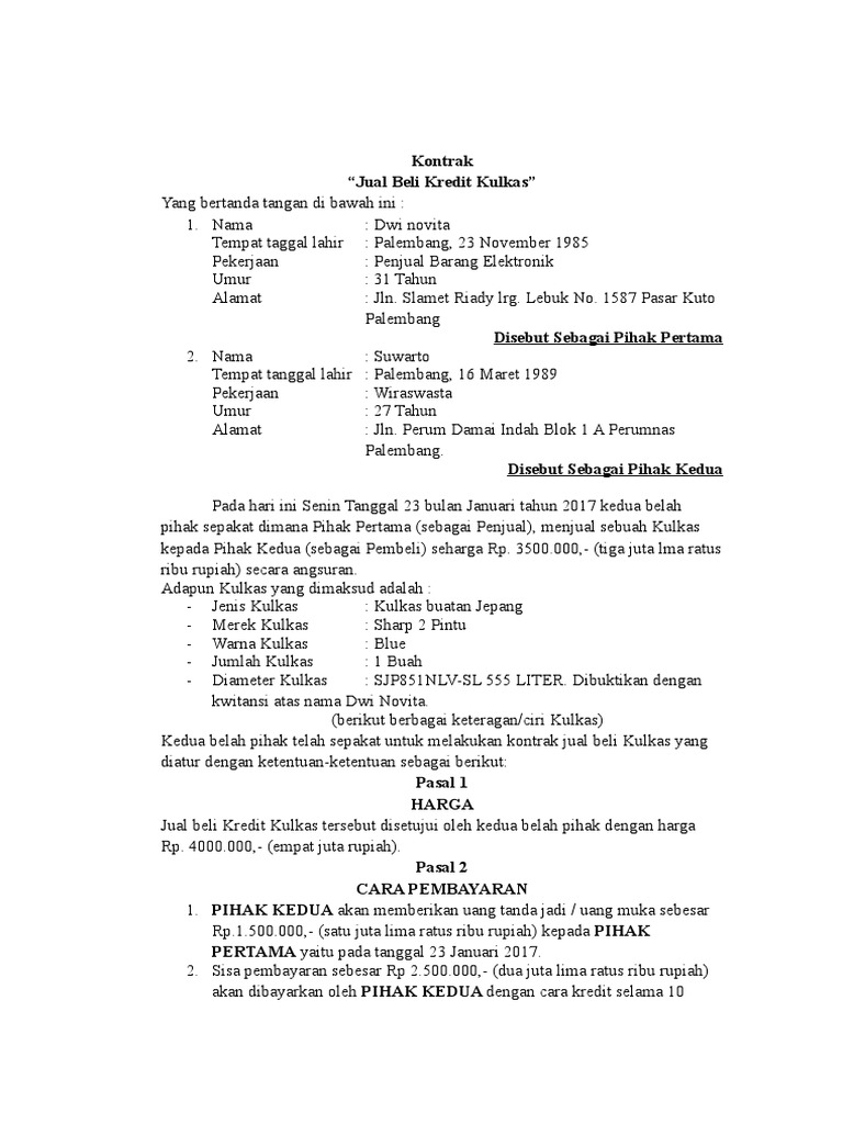 Bahwa pihak kedua mulai ditandatanganinya surat perjanjian ini sampai dengan masa kredit kendaraan tersebut berakhir sisa masa kredit 17 bulan m empunyai kewajiban membayar angsuran paling lambat tanggal 5 lima setiap bulannya sebesar rp 8737500 delapan juta tujuh ratus tiga puluh tujuh ribu lima ratus rupiah. Proses peminjaman kredit di bank ini biasanya rumit dan harus melalui banyak birokrasi. Jika berurusan dengan uang ada baiknya menggunakan surat perjanjian agar tidak menjadi masalah di kemudian hari termasuk dalam urusan meminjam uang yang akan dilunasi secara kredit. Surat ini berisi pasal pasal perjanjian kredit antara bank dengan peminjam. Surat jual beli mobil bekas tidak jarang bagi konsumen untuk membuat kesalahan dengan menandatangani kontrak tanpa membacanya terlebih dahulu. Contoh surat perjanjian kredit ini adalah contoh bentuk perjanjian kredit lengkap dengan pasal pasalnya yang dilakukan dihadapan notaris.