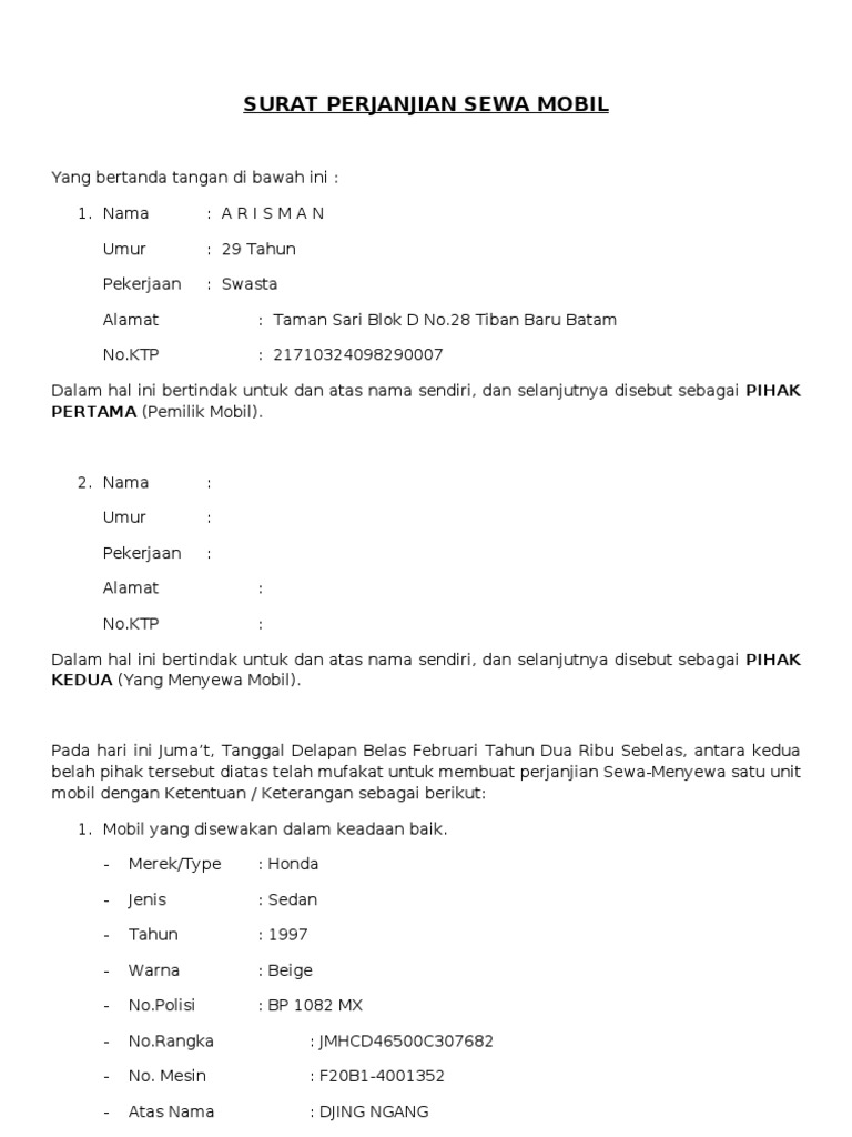 Perjanjian ini sangat penting dibuat untuk menghindari timbulnya perselisihan. Klik di sini untuk download. Namun apapun bentuknya mau pribadi atau usaha tentunya membutuhkan perjanjian yang mengikat kedua belah pihak penyewa dengan yang menyewakan. Surat perjanjian sewa mobil ini sebenarnya tidak jauh berbeda dengan dua jenis surat perjanjian yang telah disebutkan di atas. Atau untuk surat perjanjian sewa bis surat perjanjian sewa mobil bak angkutan barang dll. 0024786523 sebagai pihak yang.