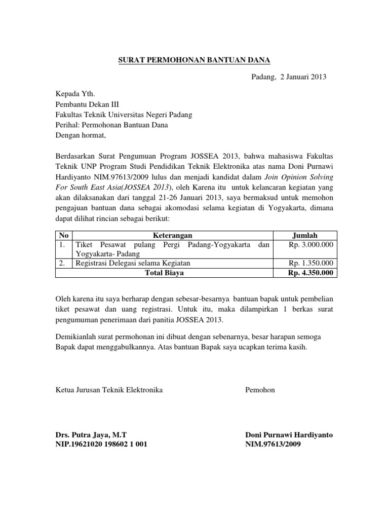 Berikut ini saya sajikan contoh surat permohonan bantuan dana yang bisa kamu jadikan referensi. Contoh surat pengajuan dalam dunia kerja surat pengajuan terbilang sangat sering dipergunakan. Dalam hal ini ketika anda menginginkan sesuatu hal namun tidak bisa memutuskannya sendiri dan harus meminta persetujuan dari pihak lain. Saat kamu akan membuat acara besar maka akan sangat membutuhkan dukungan dana dari berbagai pihak. Selain berfungsi sebagai bahan pencatatan administrasi. Pengajuan atau permohonan bisa dibuat oleh bawahan kepada pimpinan ataupun antar instansi dan kantor.