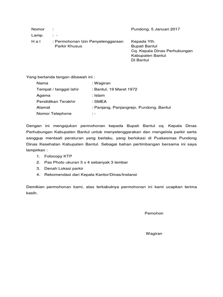 Contoh surat permohonan izin tempat parkir. Pada umumnya kita bisa mendapatkan surat rekomendasi dari pihak lain ataupun dari pejabat yang berwenang di bidang tertentu. Contoh surat permohonan izin tempat parkirnah bagi anda yang ingin menulis surat ini alangkah baiknya anda memperhatikan kosa kata dan penulisannya yang baik dan benar agar dalam membuat contoh surat izin peminjaman tempat ini bisa anda terapkan dengan baik sebagai refrensi. 15 contoh surat permohonan izin untuk berbagai kepentingan walaupun penggunaan surat belakagan ini sudah semakin menurun namun masih ada beberapa contoh surat yang tetap digunakan hingga sekarang. Contoh surat permohonan izin tempat parkir viral contoh surat permohonansewa tempat surat balasan permohonan izin pinjam kelas 10 contoh surat permohonan dengan penulisan yang baik dan benar surat permohonan izin tempat surat permohonan izin kegiatan suratmenyuratnet surat. Permohonan izin tempat kepada yth. Surat an izin pemberitahuan keramaian.