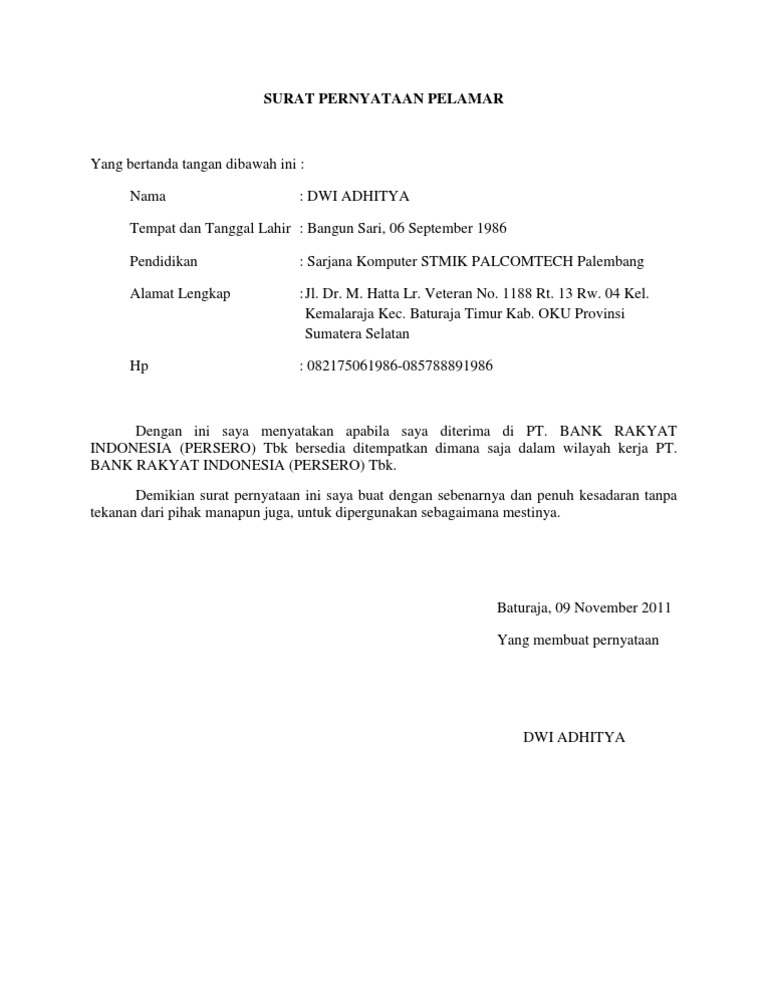 Teknik penulisan surat pernyataan penempatan kerja. Namun ada beberapa persyaratan pernyataan yang harus dilampirkan memiliki kesamaan salah satunya adalah pernyataan kemauan untuk ditempatkan dimana saja di wilayah indonesia.