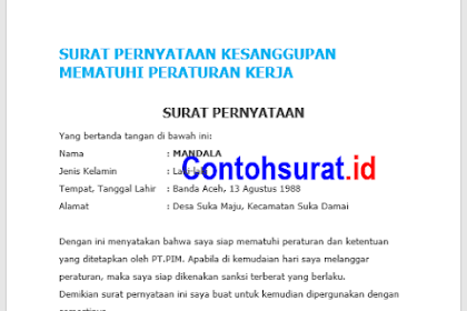 Surat pernyataan kesanggupan mematuhi peraturan kerja. Dan isinya tidak cocok dengan yang anda inginkan. Dan jika anda bergabung di dalamnya haruslah mematuhi aturan yang sudah ditetapkan. Nah dibawah ini akan kami tunjukan salah satu contoh surat pernyataan kesanggupan mematuhi peraturan. Yang mana hal tersebut harus di taati oleh setiap yang ada didalamnya. Dalam setiap instansi maupun perusahaan pastinya akan mempunyai aturannya masing masing.